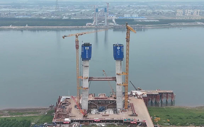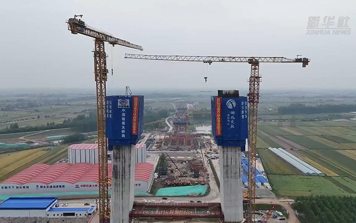 初秋時節(jié),長江之畔,兩臺徐工XGT600A-25S塔機(jī)鐵臂揮舞,助力荊州李埠長江公鐵大橋南岸主塔下游側(cè)第18節(jié)塔柱順利完成澆筑。