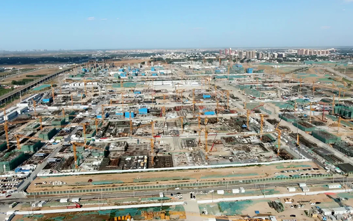 上百臺(tái)徐工XGT6015-8S1 塔機(jī)在容西片區(qū)安置房組成 “群塔矩陣”,在密集建筑群中同步作業(yè)。