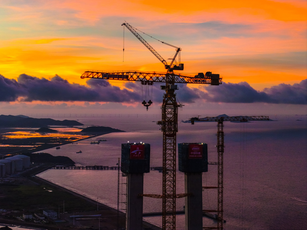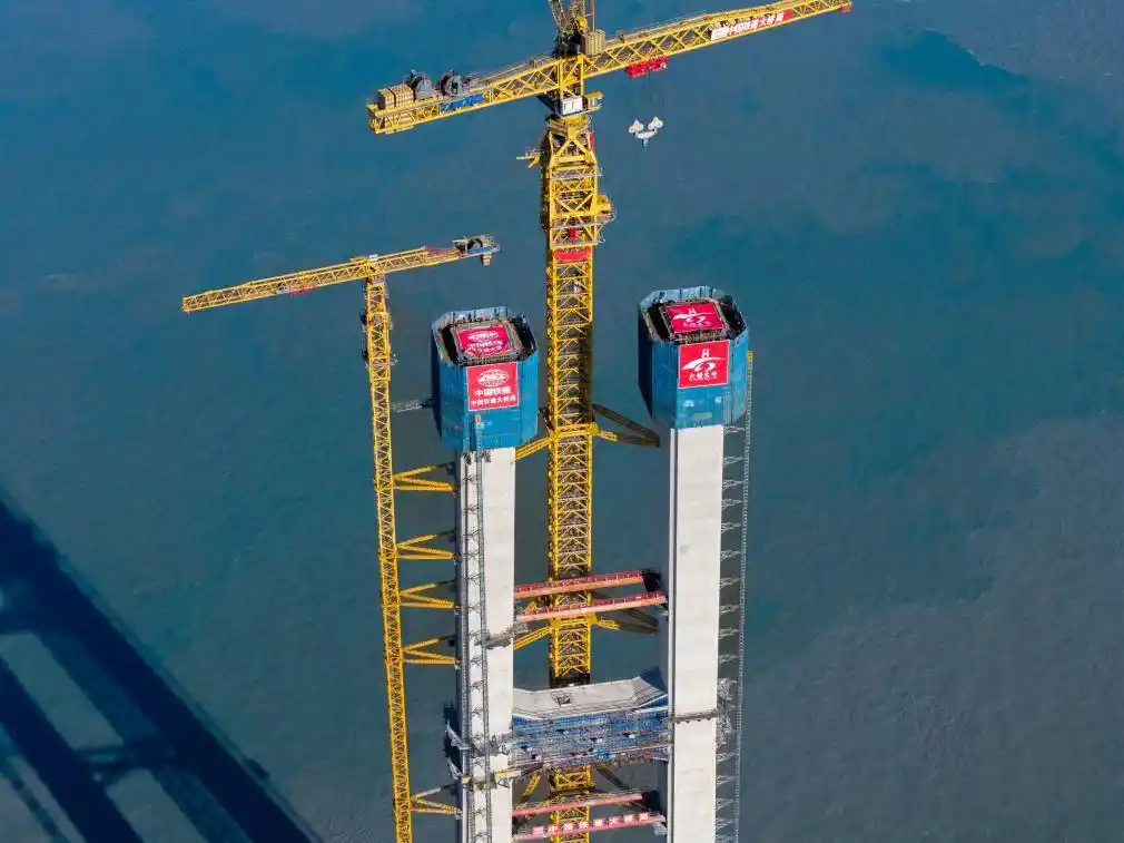 在封頂作業(yè)中,徐工塔機將百噸構(gòu)件以毫米級精度吊裝至200余米高空,硬剛10級海風,創(chuàng)造了海上橋梁建設新紀錄。多臺群塔協(xié)同作業(yè),創(chuàng)造性攻克"高空精度、抗風穩(wěn)性、吊裝效率"三大世界級施工難題,展現(xiàn)了中國裝備的卓越性能。