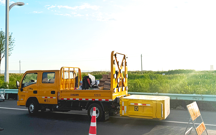 不光是安全衛(wèi)士,它們還是高效的 “移動倉庫”。貨箱敞開著,里面整齊碼放著鐵鍬、瀝青、警示錐等施工所需的工具和材料。施工時,人員無需來回奔波取物,伸手就能拿到需要的東西,讓施工節(jié)奏得以加快,省去了不少麻煩。當(dāng)施工收尾,防撞緩沖車駛離后,留下的不僅是平整的路面,更有它們?yōu)檫@次施工全程護(hù)航的印記。