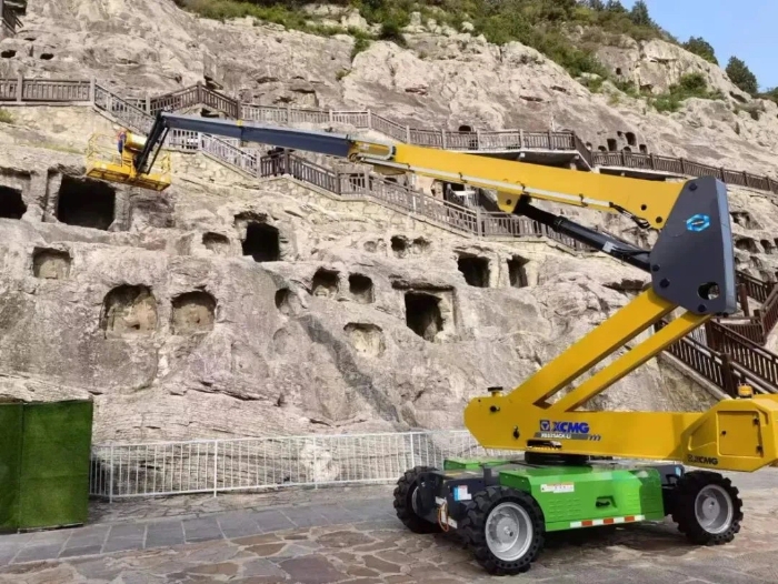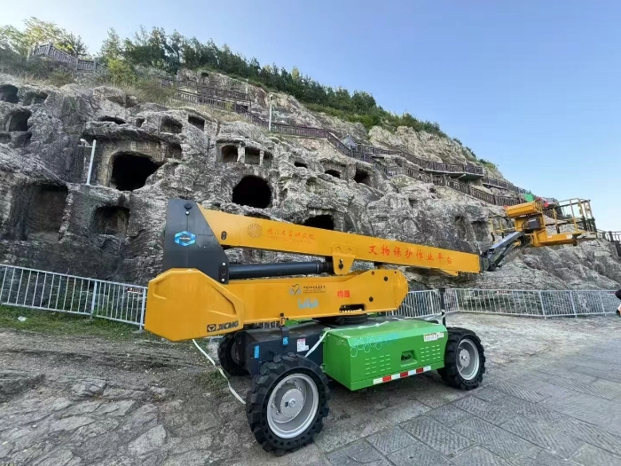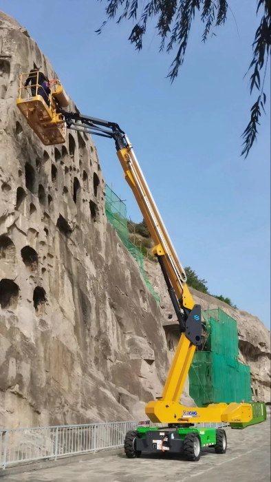 時(shí)間回溯到2021年,由于遭受多場暴雨侵襲,龍門石窟部分洞窟內(nèi)滲漏水嚴(yán)重甚至出現(xiàn)積水,部分山體表面巖石脫落、松動,嚴(yán)重威脅文物安全,急需得到有效治理。龍門石窟研究院隨即開展了為期1年多的“龍門石窟蓮花洞至石牛溪區(qū)域保養(yǎng)維護(hù)項(xiàng)目”。徐工XGS25ACK-Li直臂式高空作業(yè)平臺作為“得力助手”,深度參與各項(xiàng)保護(hù)修復(fù)工作。